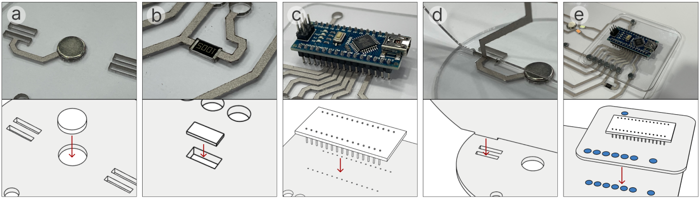 激光切割彻底改变了个人制作原型的方式。这些物体可以通过采用不同材料具有可变属性,并通过整合电子电路实现互动。然而,激光切割的物体中的电路总是具有有限的移动性,这限制了激光切割实现具有更复杂可移动功能(如机械结构)的互动原型。我们提出了MechCircuit,这是一个用于通过激光切割制作机械电子物体的设计和制造流程。我们利用钕磁铁的磁性和导电性将电子元件和机械结构连接集成到原型中。我们进行了评估,探索技术参数,并评估制造流程的实际可行性。我们还组织了一个面向非专业用户的用户观察研讨会。通过产生的原型,结果证明了MechCircuit作为一种有用和激发灵感的原型制作方法的可行性。